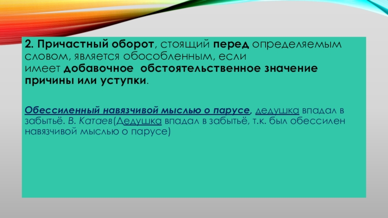 Слайд 62. Причастный оборот, стоящий перед определяемым словом, является обособленным, если имеет добавочное обстоятельственное значение