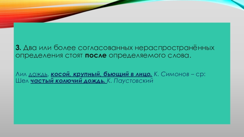 3. Два или более согласованных нераспространённых определения стоят после определяемого слова.