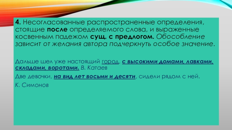 Слайд 84. Несогласованные распространенные определения, стоящие после определяемого слова, и выраженные косвенным падежом сущ. с