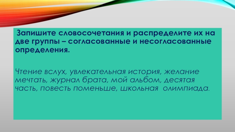 Слайд 3 Запишите словосочетания и распределите их на две группы – согласованные