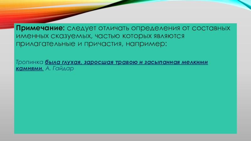 Слайд 10Примечание: следует отличать определения от составных именных сказуемых, частью которых являются прилагательные