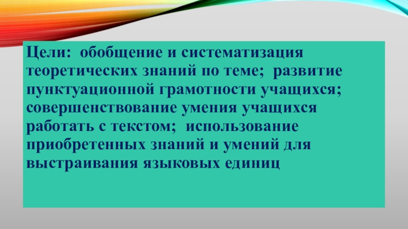 Слайд 2Цели: обобщение и систематизация теоретических знаний по теме; развитие пунктуационной грамотности