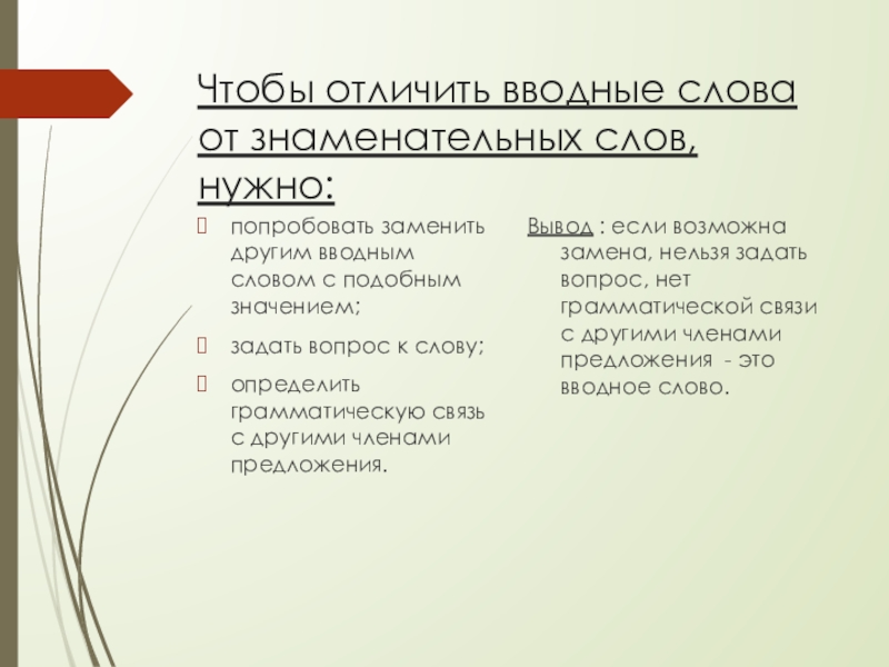 Вывод : если возможна замена, нельзя задать вопрос, нет грамматической связи с другими членами предложения - это вводное слово.