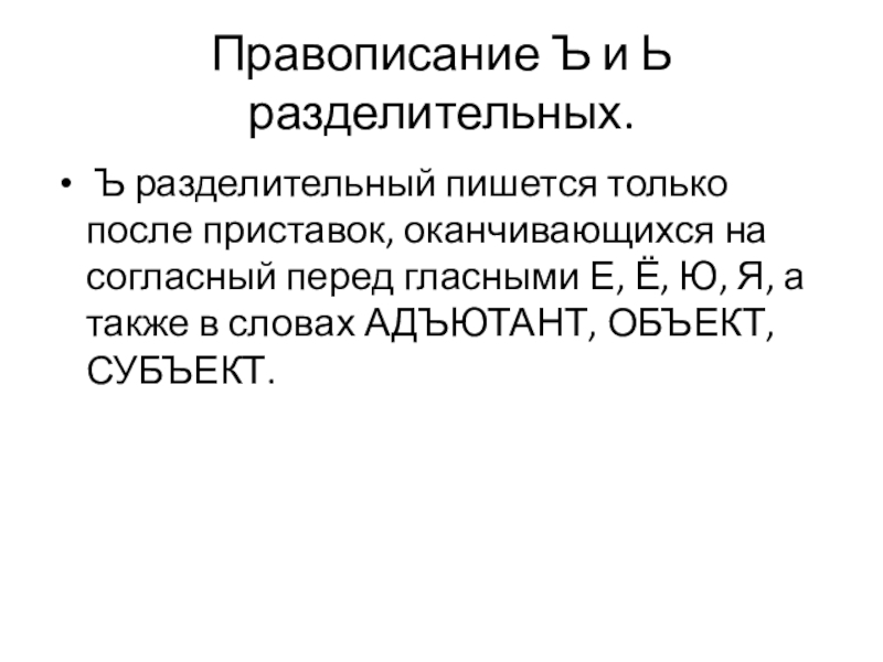 приставок, оканчивающихся на согласный перед гласными Е, Ё, Ю, Я, а также в словах АДЪЮТАНТ, ОБЪЕКТ, СУБЪЕКТ.