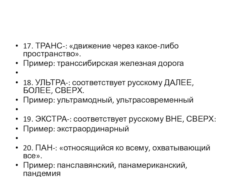 19. ЭКСТРА-: соответствует русскому ВНЕ, СВЕРХ:
