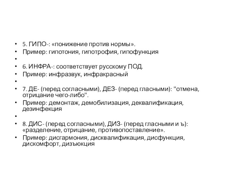 7. ДЕ- (перед согласными), ДЕЗ- (перед гласными): "отмена, отрицание чего-либо".