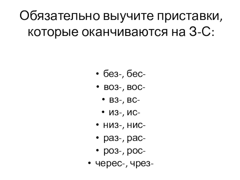 Слайд 7Обязательно выучите приставки, которые оканчиваются на З-С: