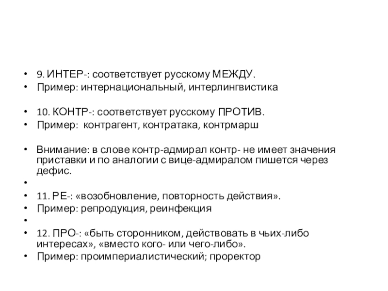 9. ИНТЕР-: соответствует русскому МЕЖДУ.