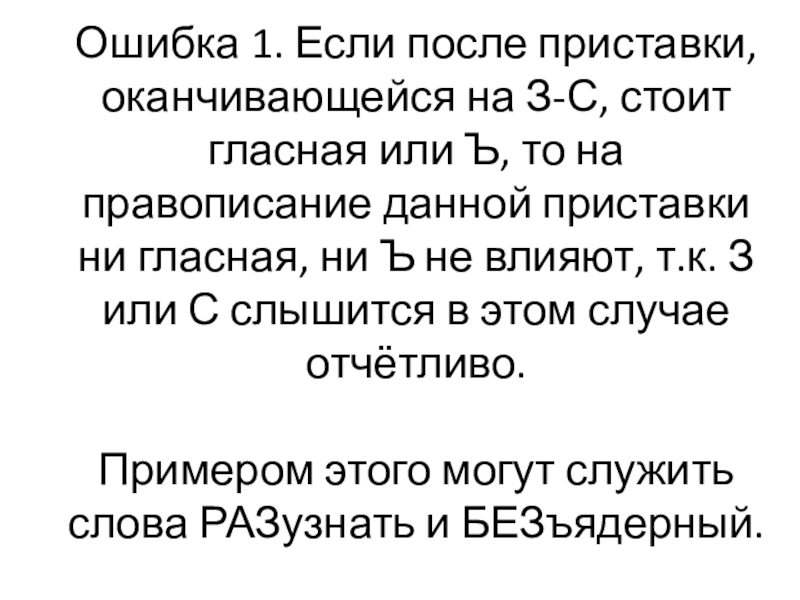 Слайд 8Ошибка 1. Если после приставки, оканчивающейся на З-С, стоит гласная или