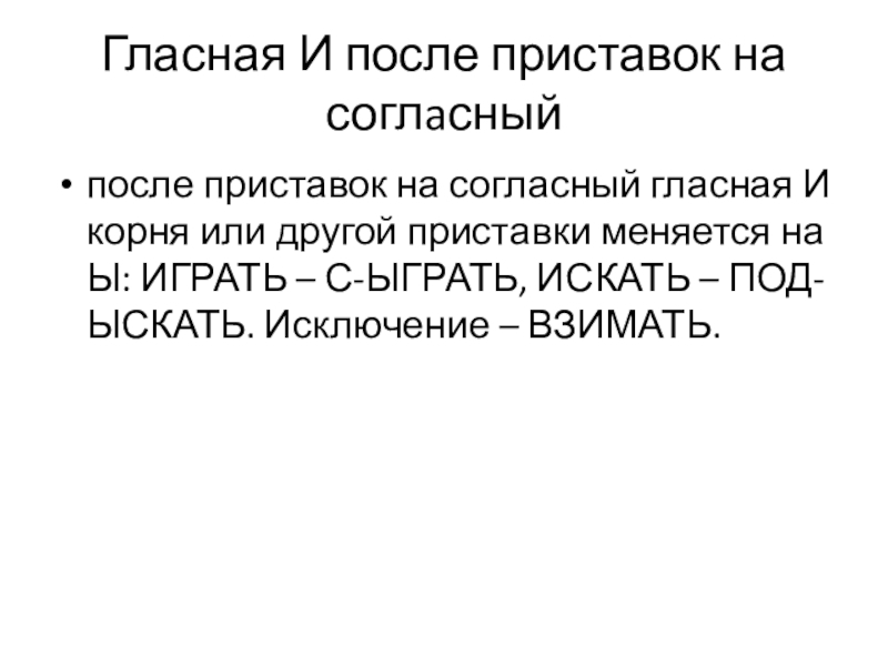 корня или другой приставки меняется на Ы: ИГРАТЬ – С-ЫГРАТЬ, ИСКАТЬ – ПОД-ЫСКАТЬ. Исключение – ВЗИМАТЬ.