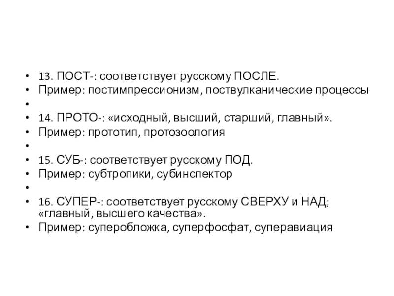 13. ПОСТ-: соответствует русскому ПОСЛЕ.