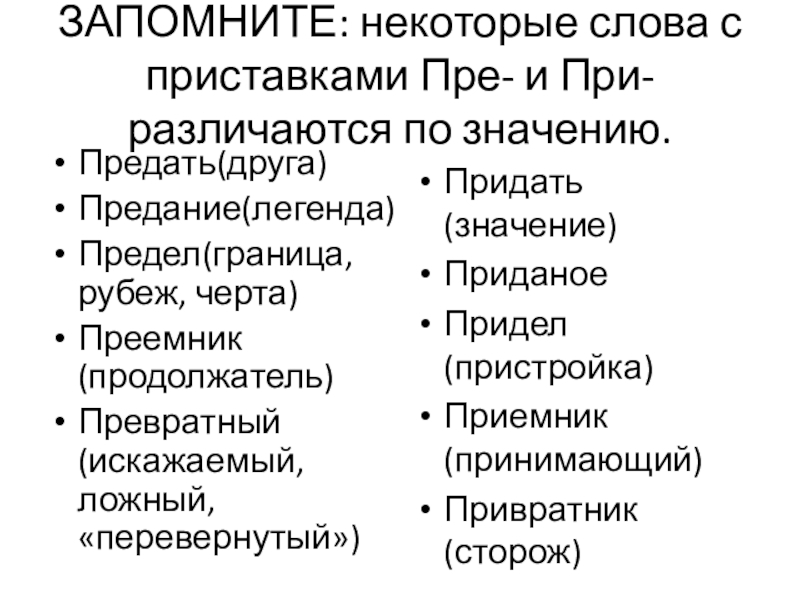 Слайд 28ЗАПОМНИТЕ: некоторые слова с приставками Пре- и При- различаются по значению.