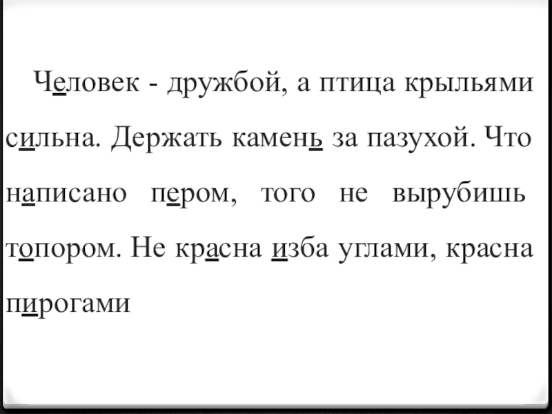 Слайд 3 Человек - дружбой, а птица крыльями сильна. Держать камень за пазухой.