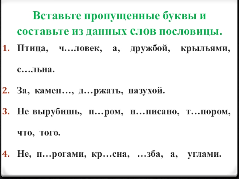 Вставьте пропущенные буквы и составьте из данных слов пословицы.Птица, ч…ловек, а, дружбой, крыльями, с…льна.За, камен…, д…ржать, пазухой.Не вырубишь, п…ром, н…писано, т…пором, что, того.Не, п…рогами, кр…сна, …зба, а, углами.
