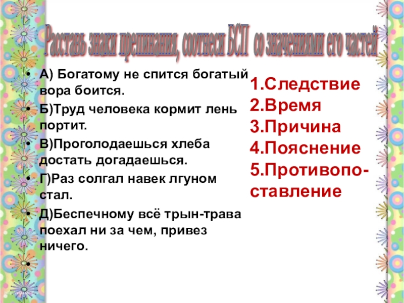 Расставь знаки препинания, соотнеси БСП со значениями его частей