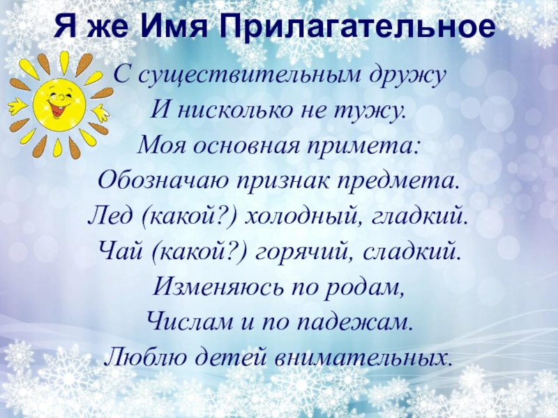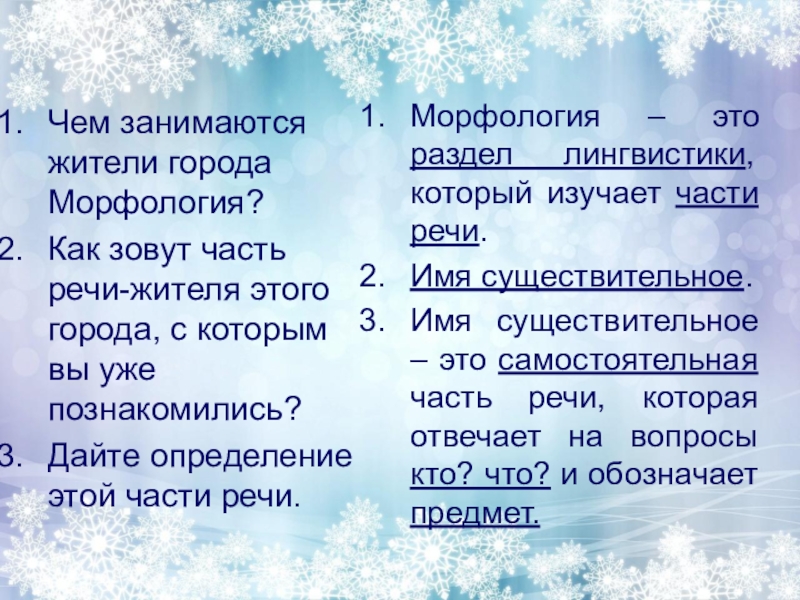 Имя существительное – это самостоятельная часть речи, которая отвечает на вопросы кто? что? и обозначает предмет.