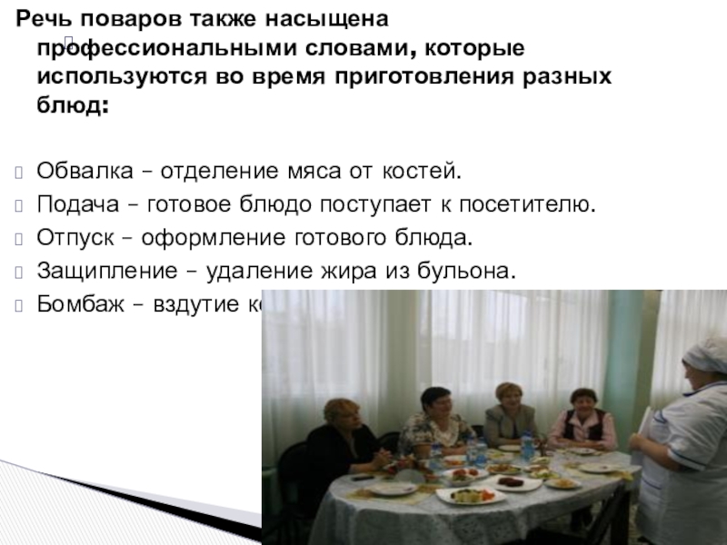 Речь поваров также насыщена профессиональными словами, которые используются во время приготовления