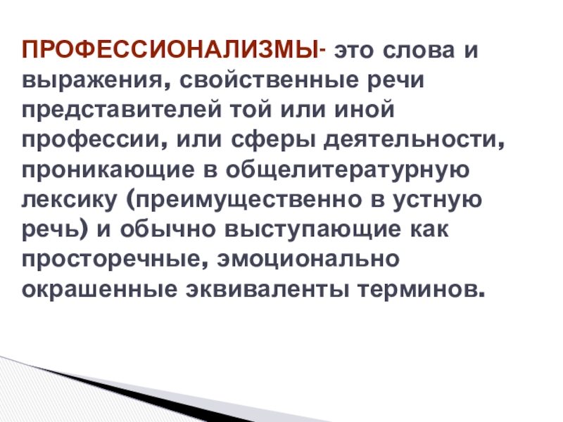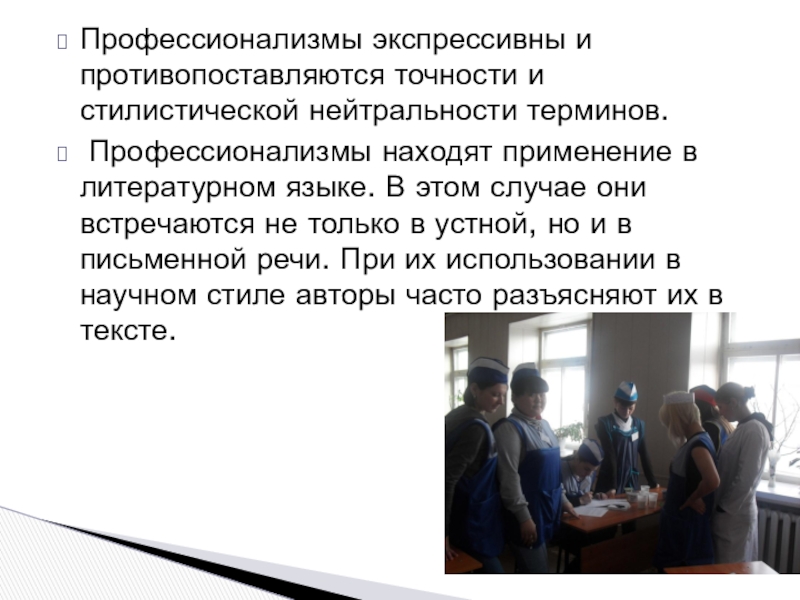 Слайд 4Профессионализмы экспрессивны и противопоставляются точности и стилистической нейтральности терминов.