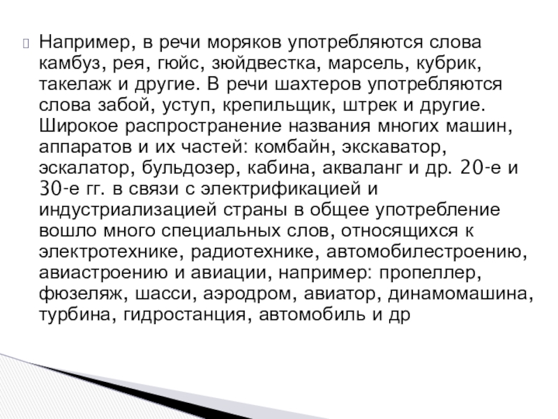 кубрик, такелаж и другие. В речи шахтеров употребляются слова забой, уступ, крепильщик, штрек и другие. Широкое распространение названия многих машин, аппаратов и их частей: комбайн, экскаватор, эскалатор, бульдозер, кабина, акваланг и др. 20-е и 30-е гг. в связи с электрификацией и индустриализацией страны в общее употребление вошло много специальных слов, относящихся к электротехнике, радиотехнике, автомобилестроению, авиастроению и авиации, например: пропеллер, фюзеляж, шасси, аэродром, авиатор, динамомашина, турбина, гидростанция, автомобиль и др
