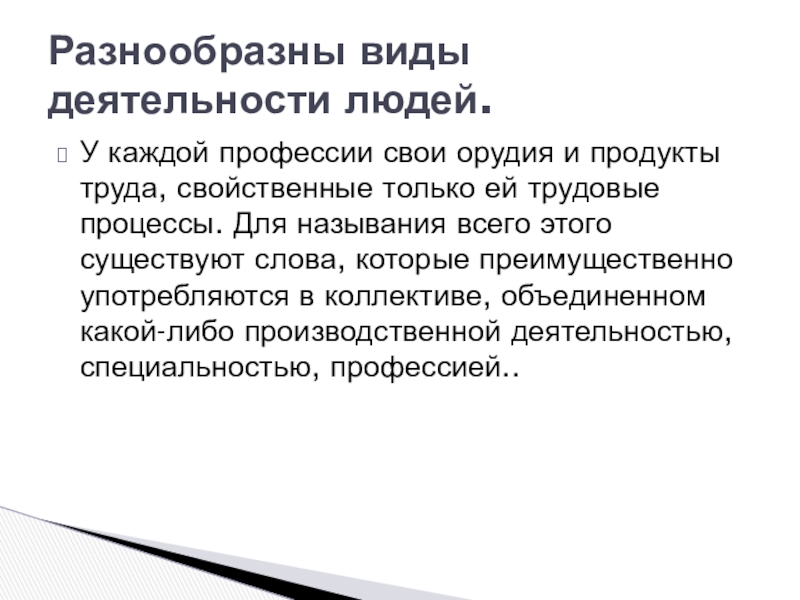 трудовые процессы. Для называния всего этого существуют слова, которые преимущественно употребляются в коллективе, объединенном какой-либо производственной деятельностью, специальностью, профессией..