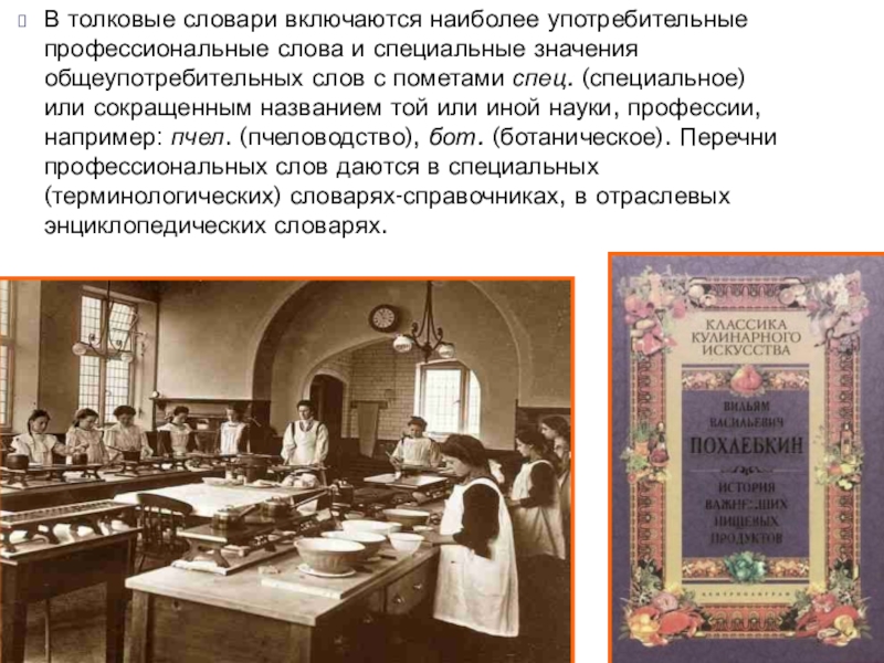 Слайд 8В толковые словари включаются наиболее употребительные профессиональные слова и специальные значения