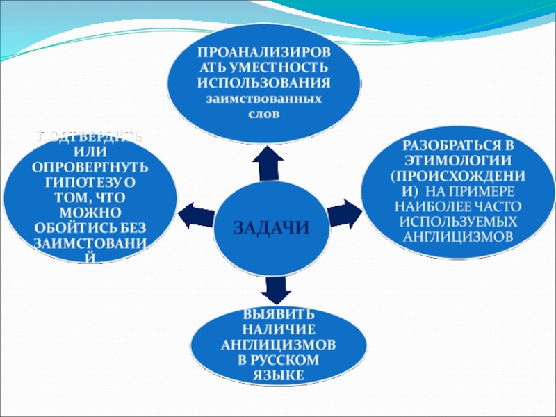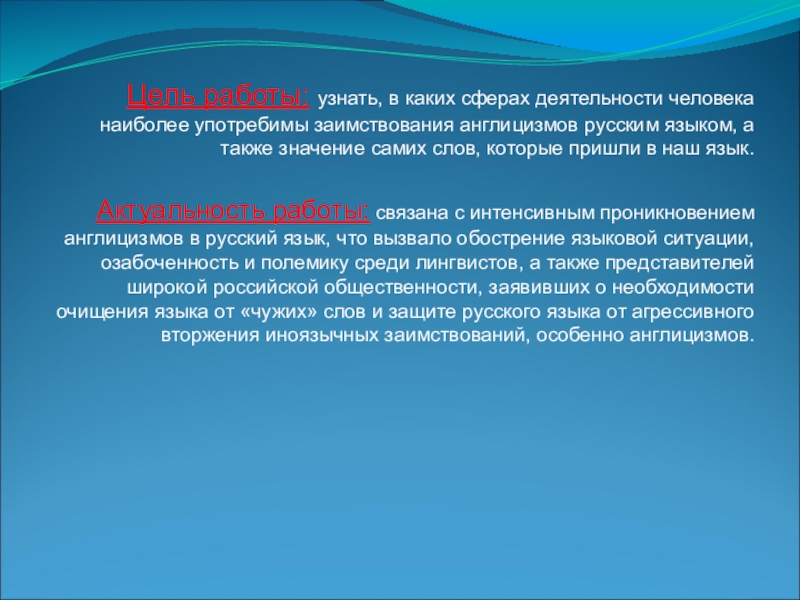 Актуальность работы: связана с интенсивным проникновением англицизмов в русский язык, что вызвало обострение языковой ситуации, озабоченность и полемику среди лингвистов, а также представителей широкой российской общественности, заявивших о необходимости очищения языка от «чужих» слов и защите русского языка от агрессивного вторжения иноязычных заимствований, особенно англицизмов.