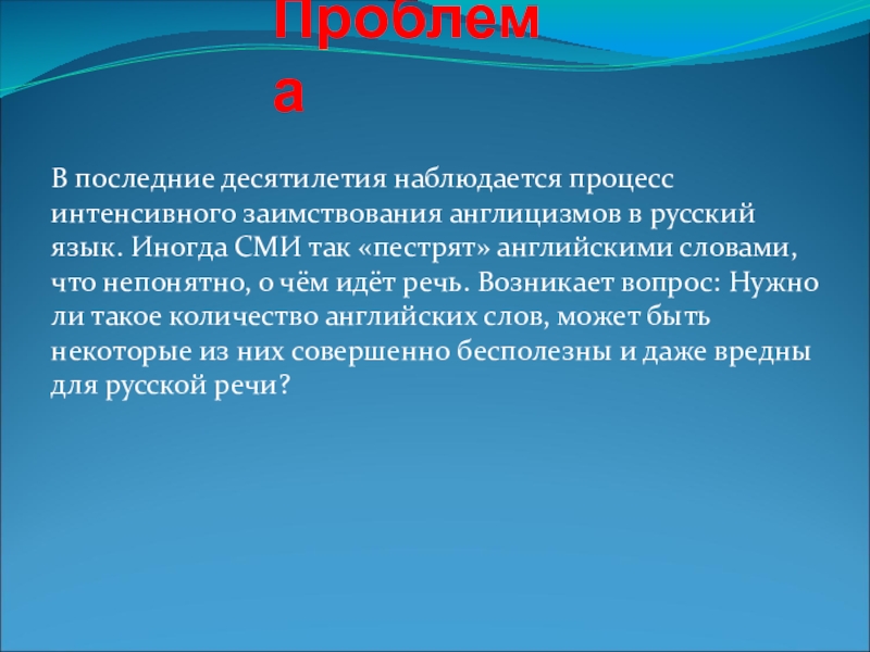 В последние десятилетия наблюдается процесс интенсивного заимствования англицизмов в русский язык.