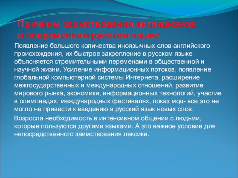 Слайд 7Причины заимствования англицизмов
