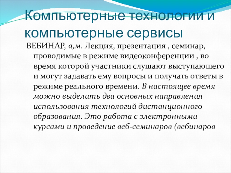 в режиме видеоконференции , во время которой участники слушают выступающего и могут задавать ему вопросы и получать ответы в режиме реального времени. В настоящее время можно выделить два основных направления использования технологий дистанционного образования. Это работа с электронными курсами и проведение веб-семинаров (вебинаров