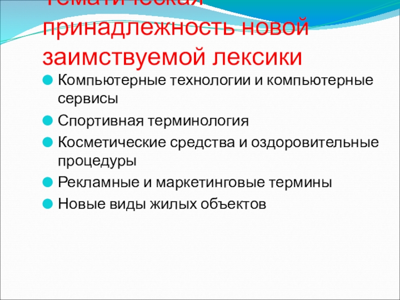 Слайд 15Тематическая принадлежность новой заимствуемой лексики