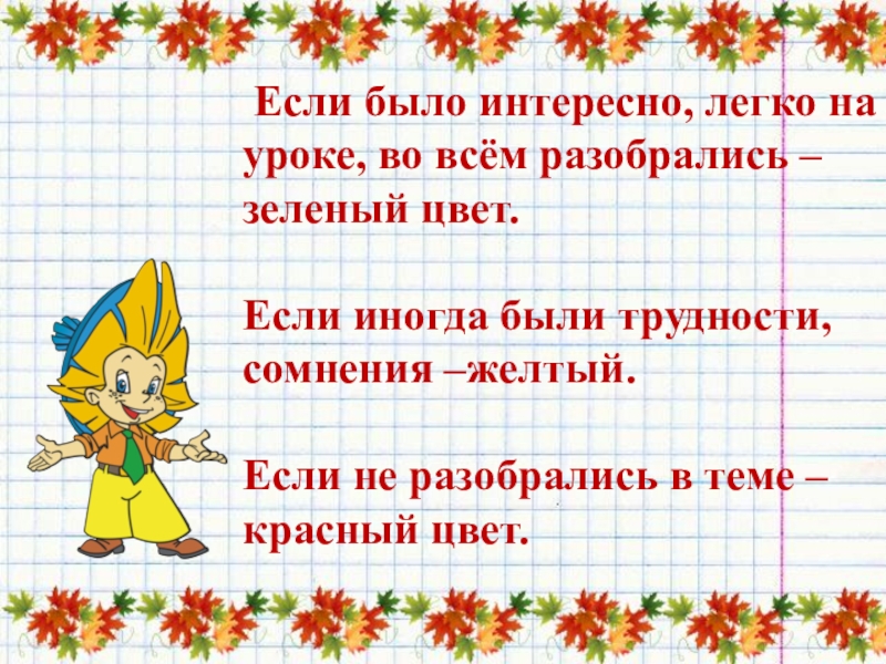 уроке, во всём разобрались –зеленый цвет. Если иногда были трудности, сомнения –желтый. Если не разобрались в теме – красный цвет.