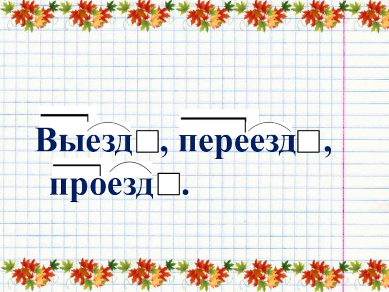 Выезд,  переезд,  проезд. Подъезд,  объяснил, подъём,  съезд, предъюбилейный.