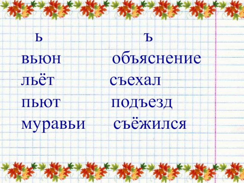 ъ вьюн объяснение льёт съехал пьют подъезд муравьи съёжился