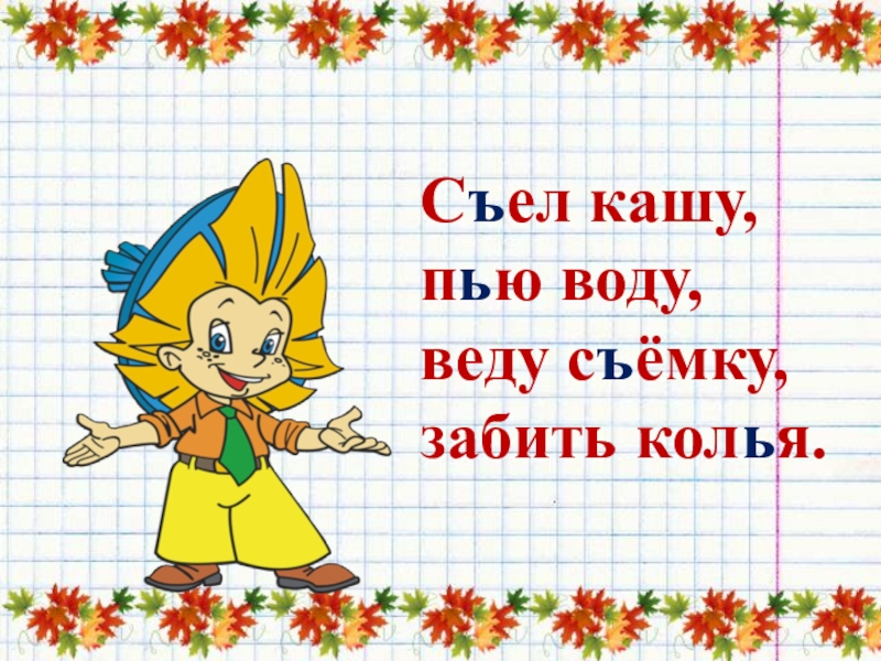 Слайд 11 Съел кашу, пью воду, веду съёмку, забить колья.