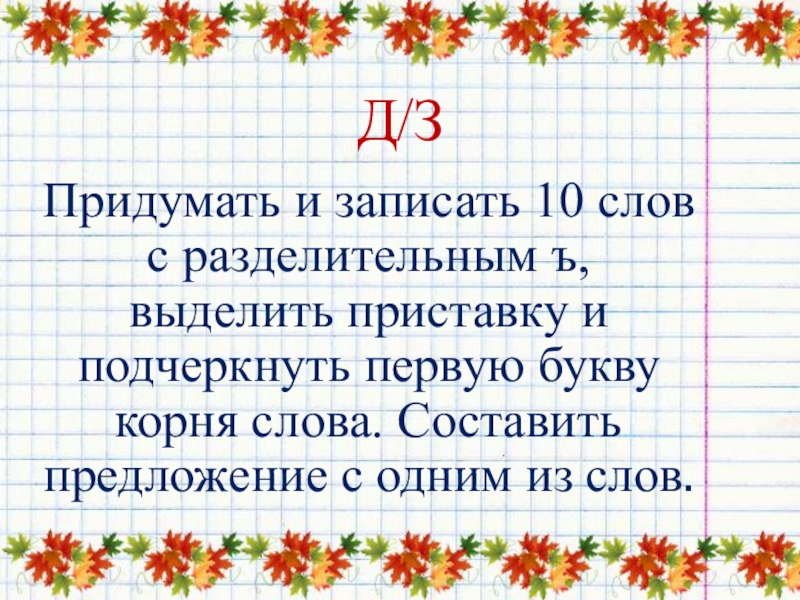 Д/ЗПридумать и записать 10 слов с разделительным ъ, выделить приставку и подчеркнуть первую букву корня слова. Составить