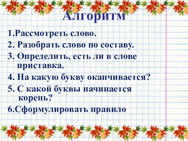 Алгоритм1.Рассмотреть слово. 2. Разобрать слово по составу.3. Определить, есть ли в слове 	приставка.4. На какую букву оканчивается?5.