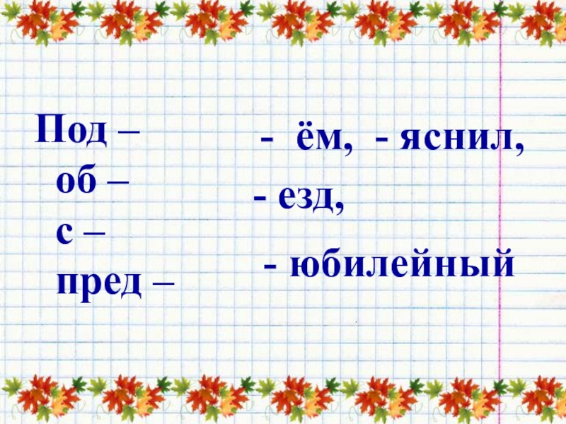 Под – об –  с –  пред –ём, - яснил,- езд,  - юбилейный