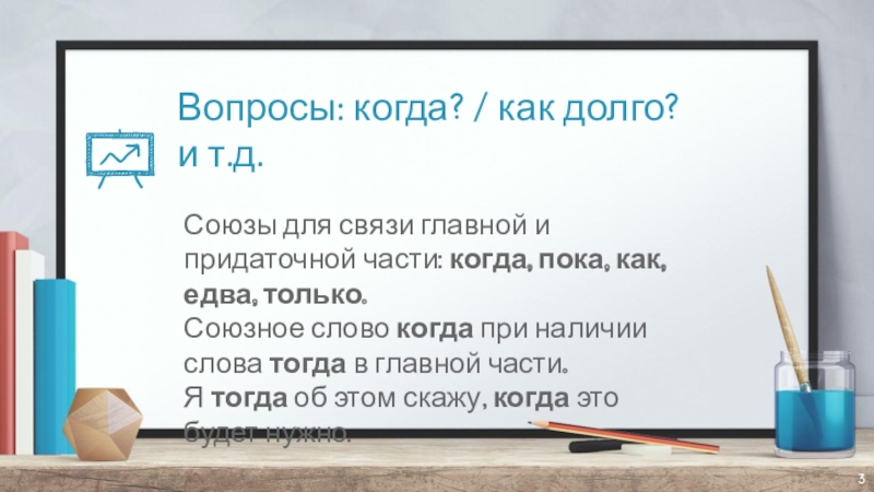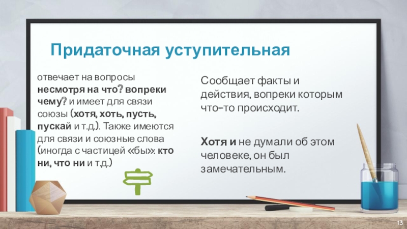 отвечает на вопросы несмотря на что? вопреки чему? и имеет для связи союзы (хотя, хоть, пусть, пускай и т.д.). Также имеются для связи и союзные слова (иногда с частицей «бы»: кто ни, что ни и т.д.)