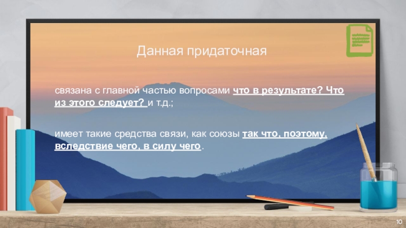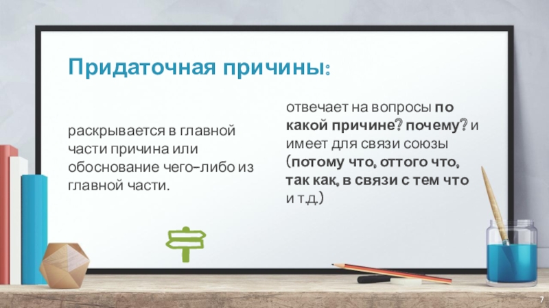 отвечает на вопросы по какой причине? почему? и имеет для связи союзы (потому что, оттого что, так как, в связи с тем что и т.д.)