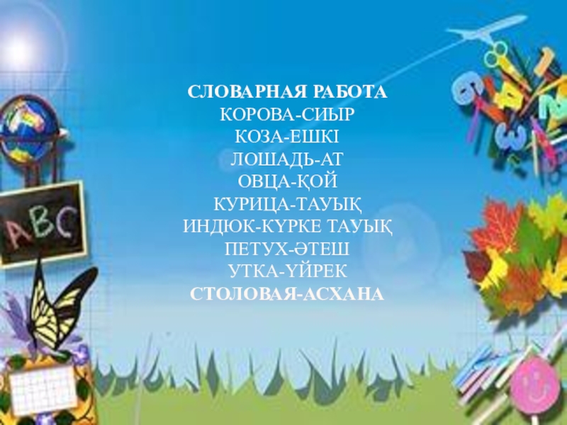 Словарная работа корова-сиыр коза-ешкі лошадь-ат овца-қой курица-тауық индюк-күрке тауық петух-әтеш утка-үйрек Столовая-асхана
