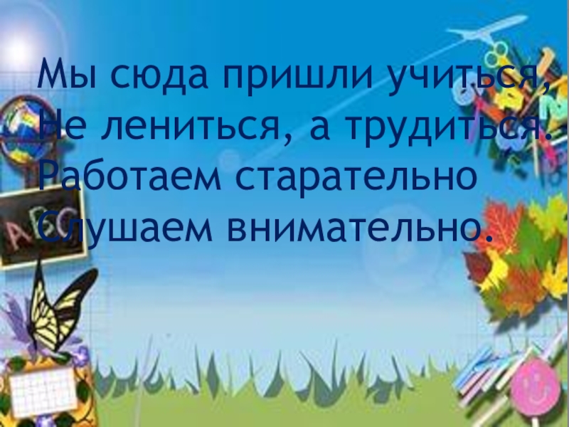 Мы сюда пришли учиться,Не лениться, а трудиться.Работаем старательноСлушаем внимательно.