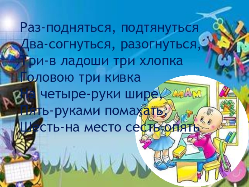 Раз-подняться, подтянутьсяДва-согнуться, разогнуться,Три-в ладоши три хлопкаГоловою три кивкаНа четыре-руки шире, Пять-руками помахать,Шесть-на место сесть опять