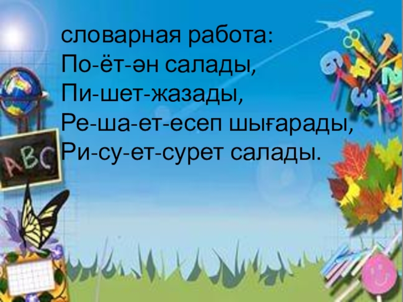 УЧИТЕЛЬНИЦАсловарная работа:По-ёт-ән салады, Пи-шет-жазады,Ре-ша-ет-есеп шығарады, Ри-су-ет-сурет салады.