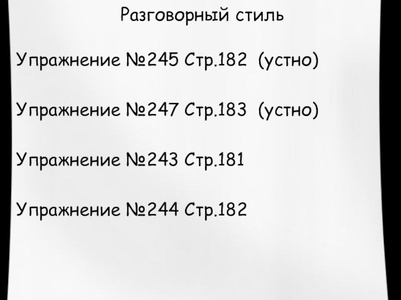 Разговорный стиль Упражнение №245 Стр.182 (устно)Упражнение №247 Стр.183 (устно)Упражнение №243 Стр.181Упражнение №244 Стр.182