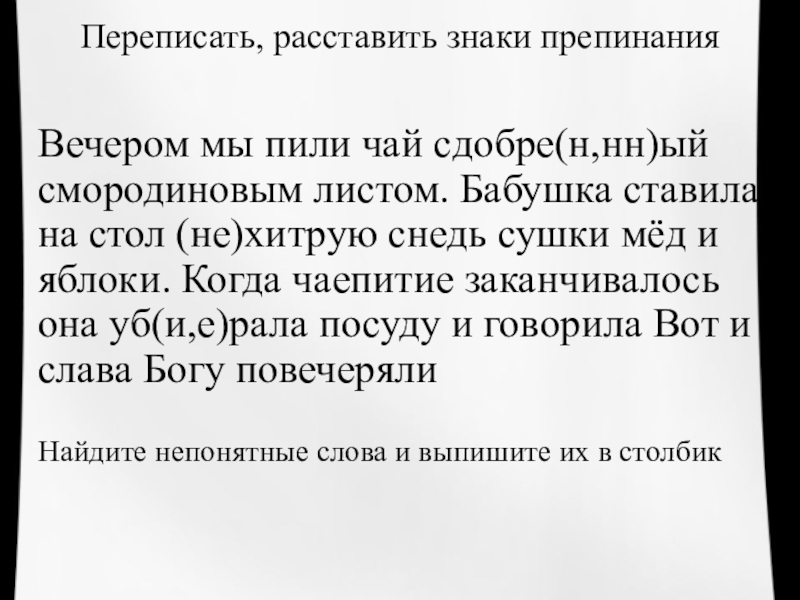Переписать, расставить знаки препинания Вечером мы пили чай сдобре(н,нн)ый смородиновым листом. Бабушка ставила на стол (не)хитрую снедь сушки мёд и яблоки. Когда чаепитие заканчивалось она уб(и,е)рала посуду и говорила Вот и слава Богу