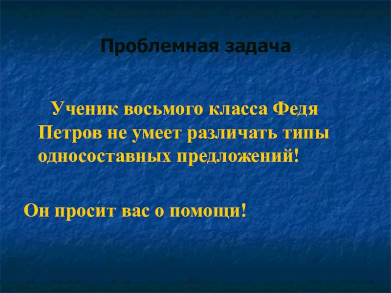 Проблемная задача   Ученик восьмого класса Федя Петров не умеет различать типы односоставных предложений!Он просит вас