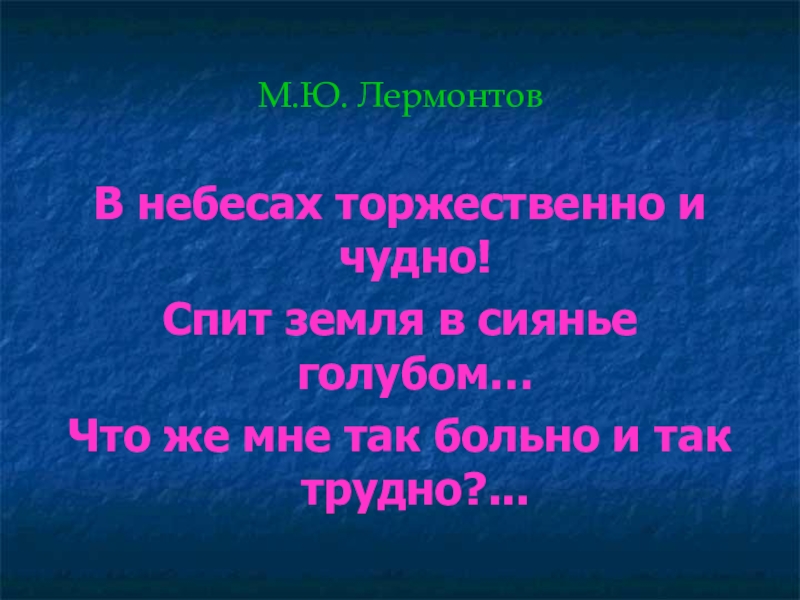 М.Ю. ЛермонтовВ небесах торжественно и чудно!Спит земля в сиянье голубом…Что же мне так больно и так трудно?...