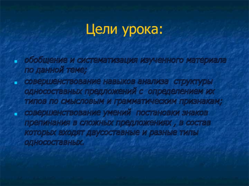 Цели урока:обобщение и систематизация изученного материала по данной теме;совершенствование навыков анализа структуры односоставных предложений с определением их типов по смысловым и грамматическим признакам;совершенствование умений постановки знаков препинания в сложных предложениях , в состав которых входят двусоставные