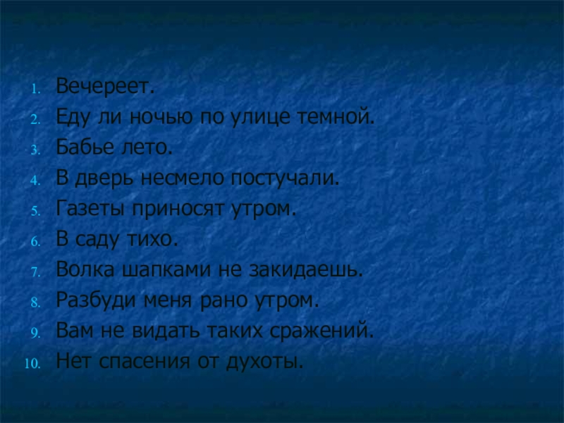 Вечереет.Еду ли ночью по улице темной.Бабье лето.В дверь несмело постучали.Газеты приносят утром.В саду тихо.Волка шапками не закидаешь.Разбуди