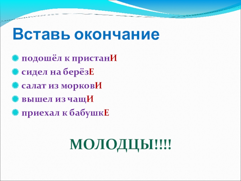 Вставь окончание подошёл к пристанИсидел на берёзЕсалат из морковИвышел из чащИприехал к бабушкЕМОЛОДЦЫ!!!!
